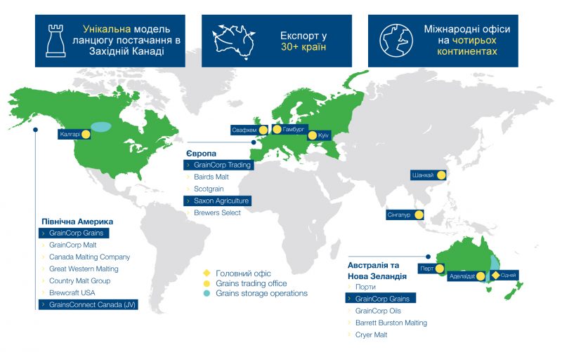 GrainCorp Limited є публічною компанією, зареєстрованою в Австралії. Основним напрямком діяльності компанії є отримання і зберігання зерна і пов’язаних з ним товарів. GrainCorp представлена через глобальні офіси в Північній Америці, Великобританії, Європі, Китаї та Сінгапурі. GrainCorp має досвід поcтачання понад 6 млн т на рік клієнтам у більш ніж 30 країнах світу.