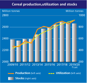 World cereal utilization forecast for 2019/20 is lifted marginally to 2 722 million tonnes, now pointing to an expansion of 33 million tonnes (1.2 percent) from the 2018/19 level. The global wheat utilization forecast remains nearly unchanged this month, as upward revisions made for China were balanced by a downward revision in the European Union resulting from lower than previoualy expected production and a faster pace in exports. Coarse grain utilization is now pegged at 1 447 million tonnes, roughly 19 million tonnes (1.3 percent) above 2018/19, following upward revisions in maize utilization made this month for the European Union and the Russian Federation on larger production than earlier anticipated. FAO’s forecast of world rice utilization in 2019/20 has been lowered by 900 000 tonnes from last month to 513 million tonnes. At this level, world rice use would still surpass the 2018/19 high by 0.9 percent, thanks to a 1.6 percent predicted expansion in food intake.