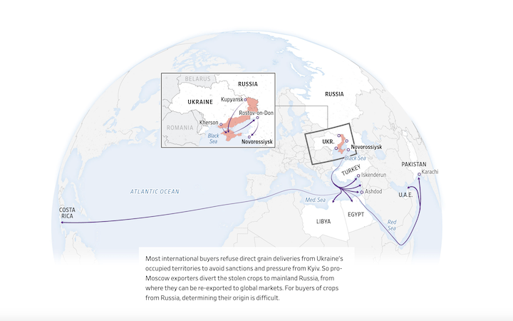 The complicity in this takes many forms. According to the US government, three of the ships exporting large volumes of illegal grain are owned through a network of corporate entities by the Russian state-owned United Shipbuilding Corporation, which also produced the warships used to fire on Ukraine.
