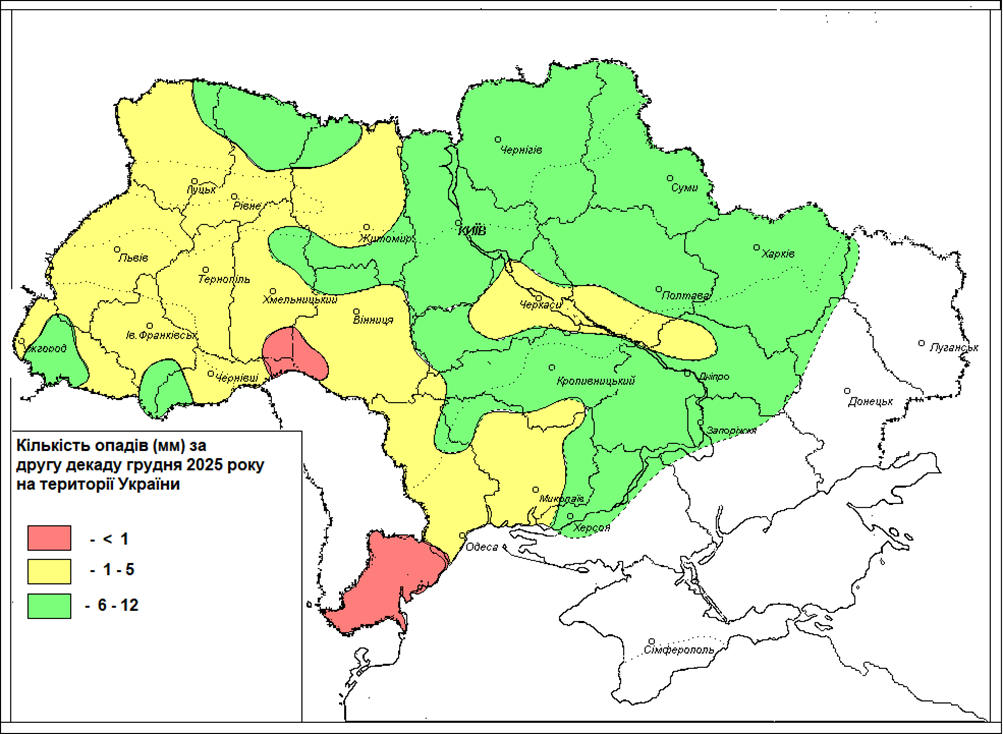 Рис. 2. Кількість опадів за другу декаду грудня 2025 року на території України, мм