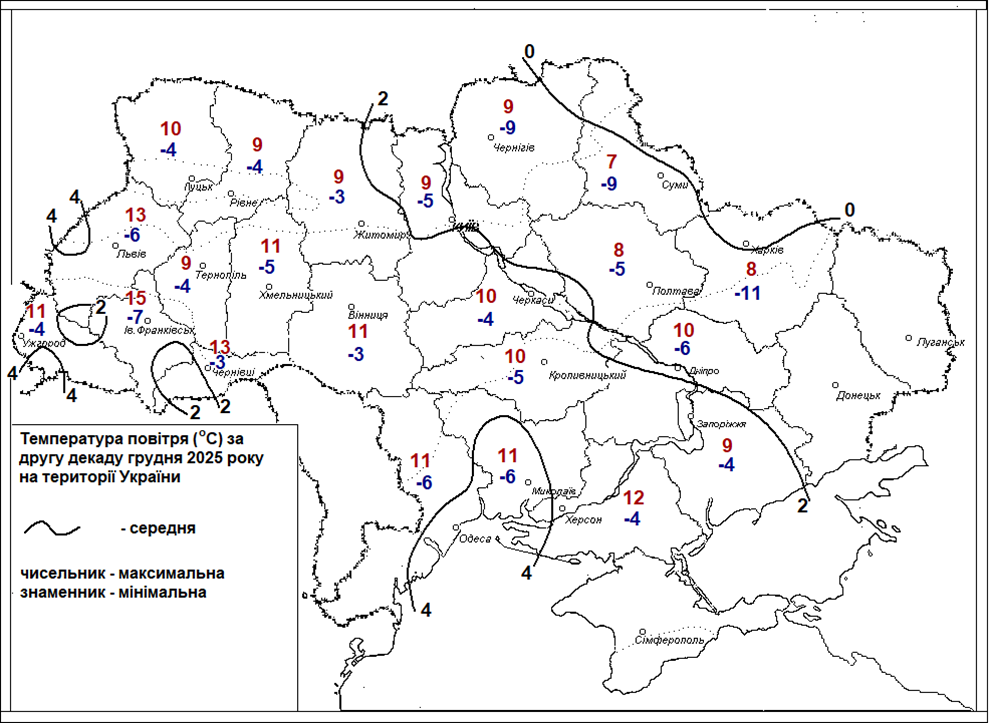 Рис. 1. Температура повітря за другу декаду грудня 2025 року на території України, °С