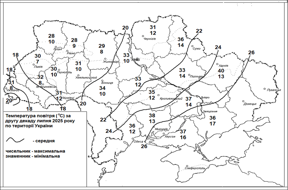 Зображення. 1 Температура повітря (°С) за другу декаду липня 2025 року по території України