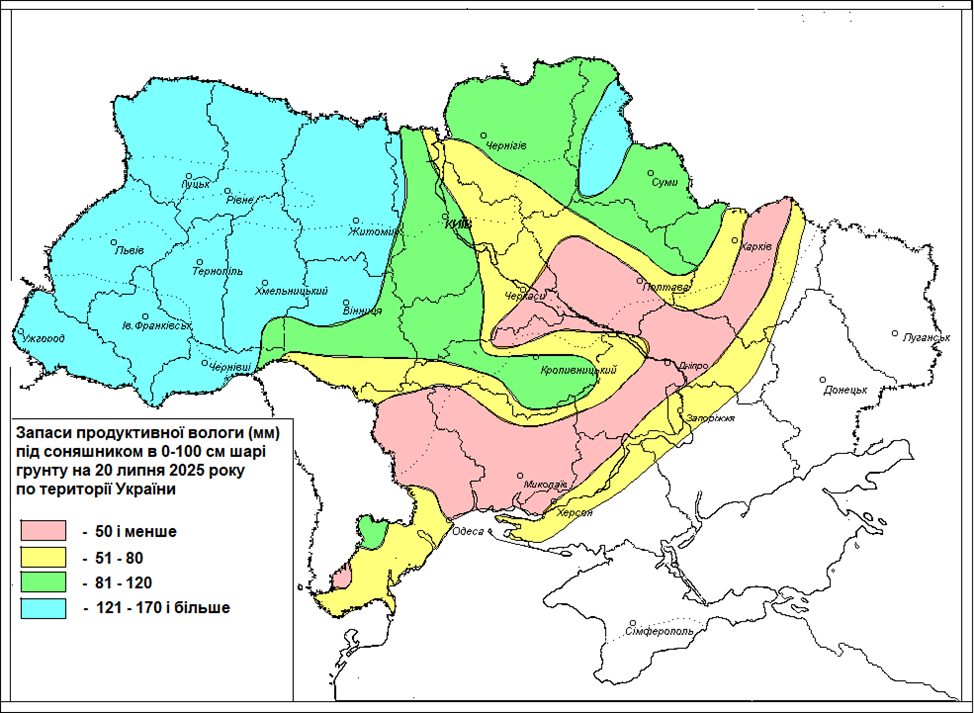 Зображення. 4 Запаси продуктивної вологи (мм) у метровому шарі ґрунту під соняшником за другу декаду липня 2025 року по території України