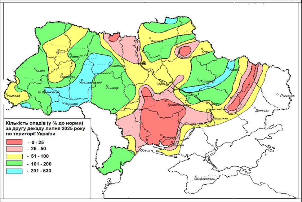 Зображення. 2 Кількість опадів (у % до норми) за другу декаду липня 2025 року по території України