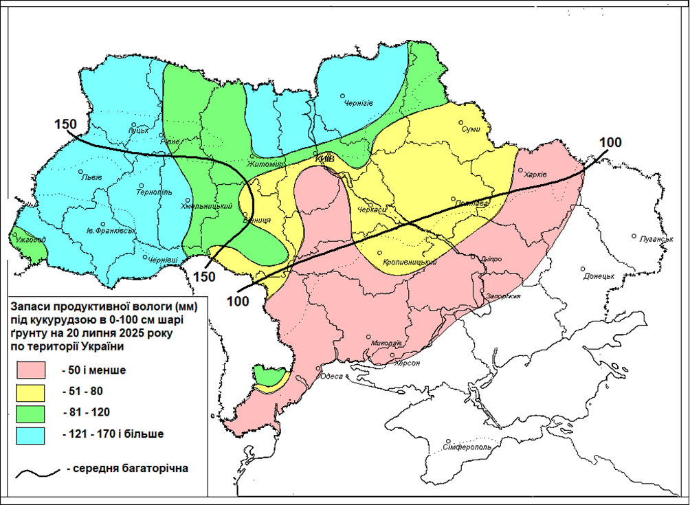 Зображення. 3 Запаси продуктивної вологи (мм) у метровому шарі ґрунту під кукурудзою за другу декаду липня 2025 року по території України