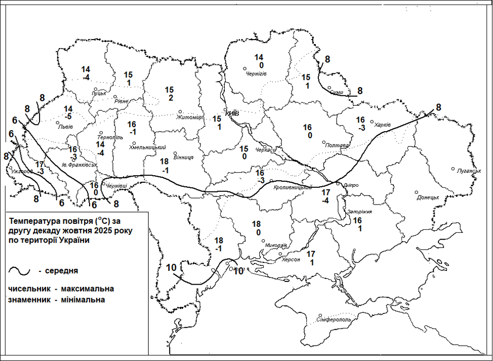 Зображення. 1. Температура повітря (°С) за другу декаду жовтня 2025 року по території України