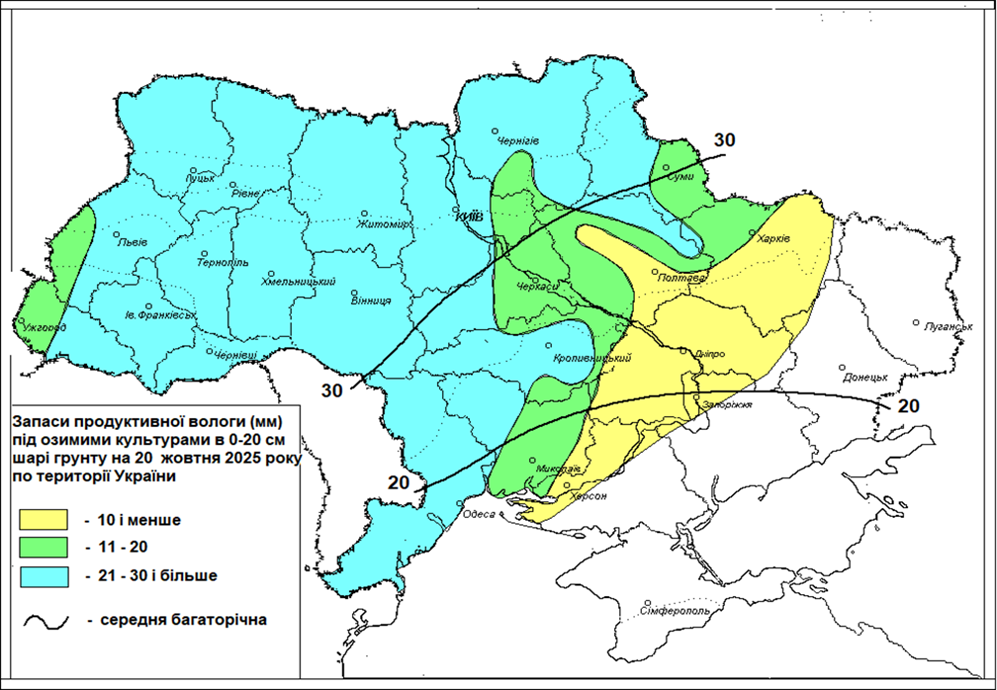 Станом на 20 жовтня запаси продуктивної вологи в орному шарі ґрунту на полях під озимими культурами на більшості площ були достатніми та оптимальними (21-30 мм і більше), місцями в західних областях відмічалося перезволоження орного шару ґрунту. У східних, на багатьох площах південних (за винятком Одеської), центральних, окремих площах північних, Львівської та Закарпатської областей вологозабезпечення було недостатнім (11-20 мм) та незадовільним (менше 10 мм продуктивної вологи). Внаслідок незначних опадів на багатьох площах Дніпропетровської та Харківської областей орний шар ґрунту залишався зовсім сухий (зображення. 3).
