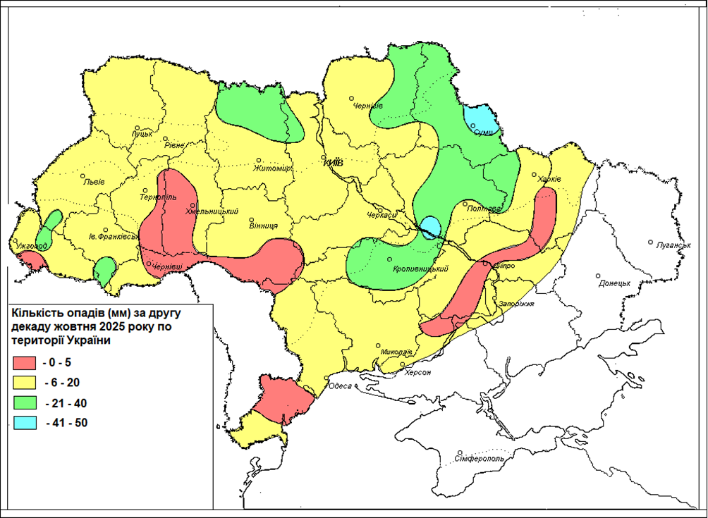 Зображення. 2. Кількість опадів (мм) за другу декаду жовтня 2025 року по території України