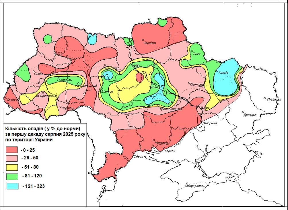 Зображення. 2 Кількість опадів (у % до норми) за першу декаду серпня 2025 року по території України