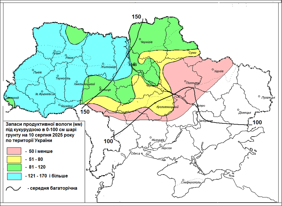 Зображення. 3 Запаси продуктивної вологи (мм) у метровому шарі ґрунту під кукурудзою за першу декаду серпня 2025 року по території України