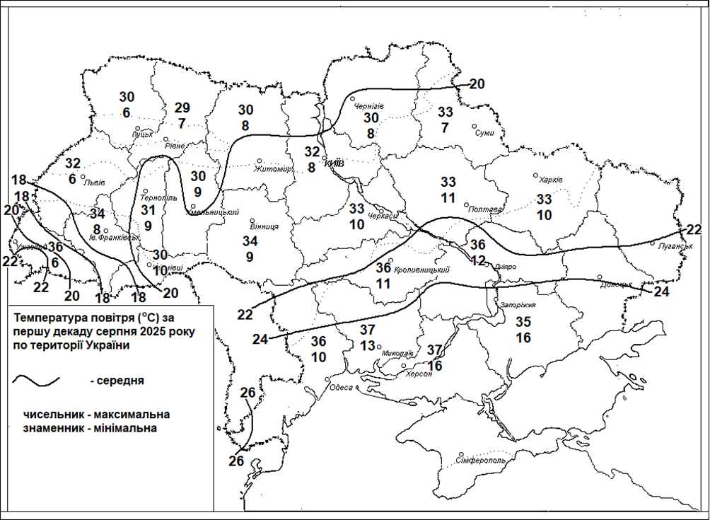 Зображення. 1 Температура повітря (°С) за першу декаду серпня 2025 року по території України