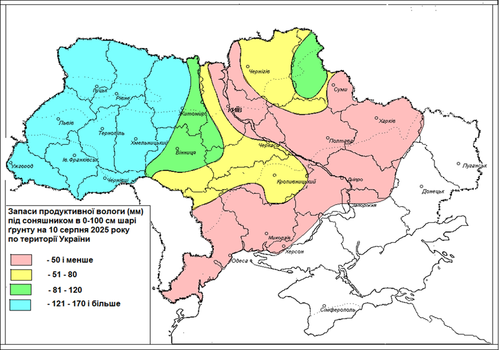 Зображення. 4 Запаси продуктивної вологи (мм) у метровому шарі ґрунту під соняшником за першу декаду серпня 2025 року по території України
