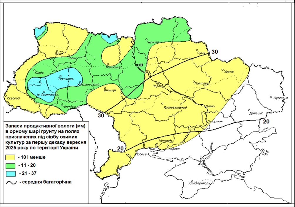 Озимина (агрометеорологічні умови сівби озимих культур в осінній період 2025 року). Через недостатню кількість ефективних опадів упродовж липня-вересня в південних, східних та центральних областях на більшості площ, призначених під сівбу озимини, тривала та поширювалася ґрунтова посуха. Станом на 10 вересня (за експертною оцінкою та фактично визначеними запасами продуктивної вологи) близько 50-60% площ були охоплені ґрунтовою посухою. Лише на полях північних та західних областей вологозабезпечення було достатнім та задовільним.