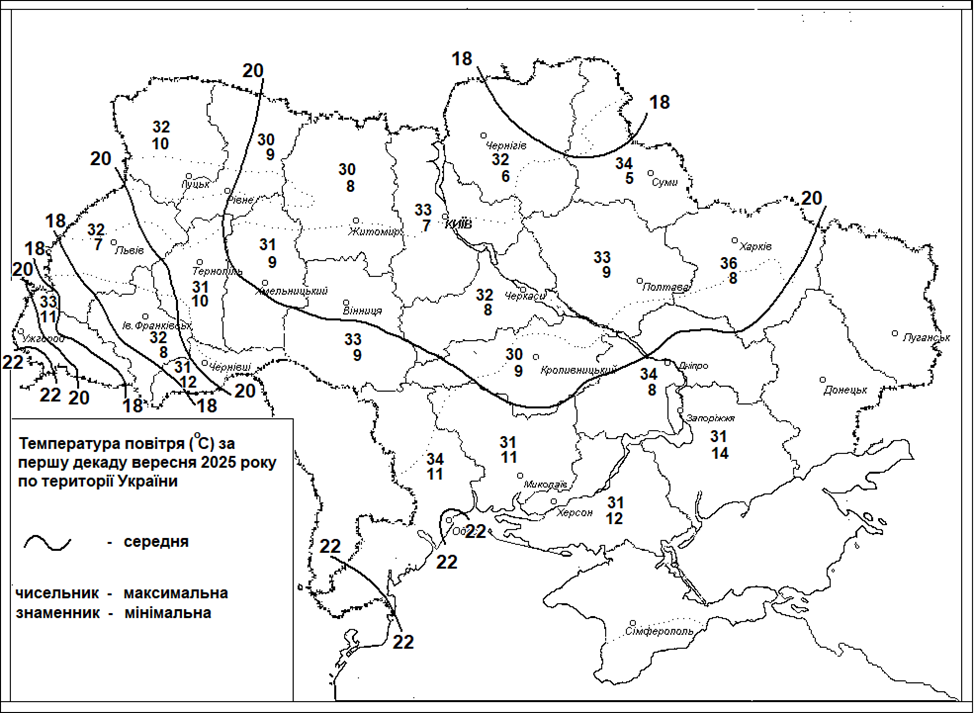 Зображення. 1 Температура повітря (°С) за першу декаду вересня 2025 року по території України
