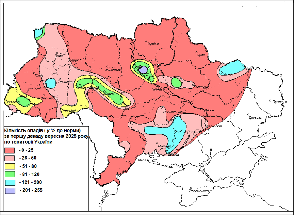 Зображення. 2 Кількість опадів (у % до норми) за першу декаду вересня 2025 року по території України