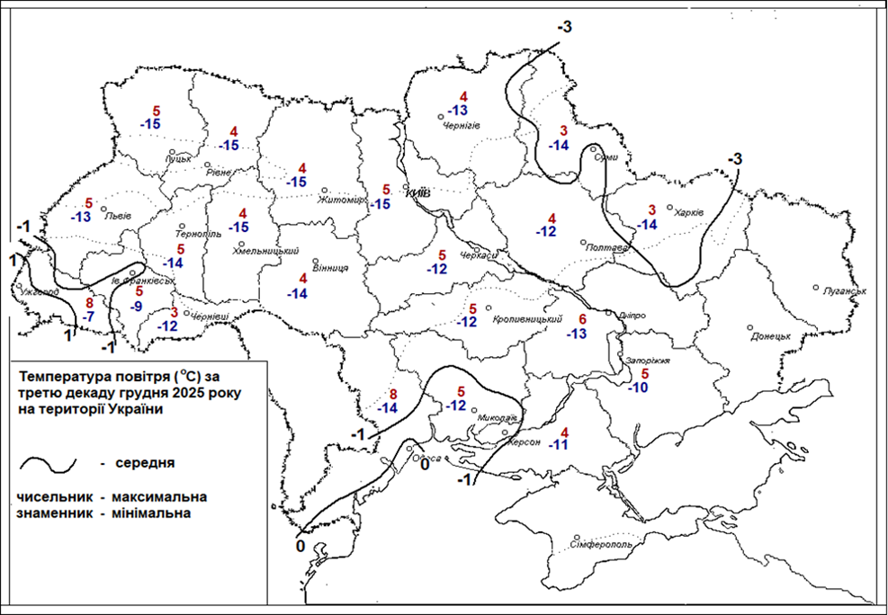 Зображення. 1. Температура повітря (°С) за третю декаду грудня 2025 року на території України