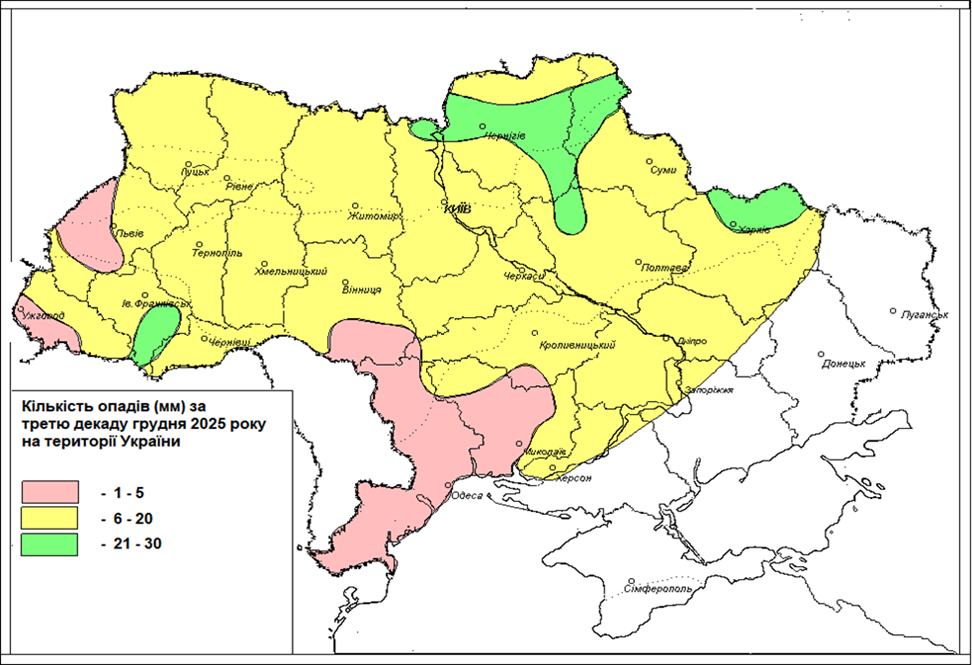 Зображення. 2. Кількість опадів (мм) за третю декаду грудня 2025 року на території України