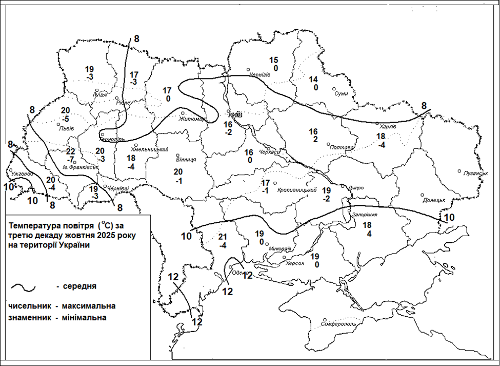 Упродовж третьої декади жовтня в Україні спостерігалася тепла для кінця жовтня з опадами погода. У більшості днів середні добові температури повітря були близькими або вищими за норму на 2-5°С, лише на початку декади – нижче норми. У найтепліші дні середньодобові температури досягали +10–16°С, що за кліматичною нормою відповідало температурі кінця вересня – початку жовтня. Вдень повітря прогрівалося від +14–15°С на півночі до +20–22°С на півдні та заході країни. У середньому температура повітря за декаду по території країни була на 1,5–3,0°С вищою за норму.