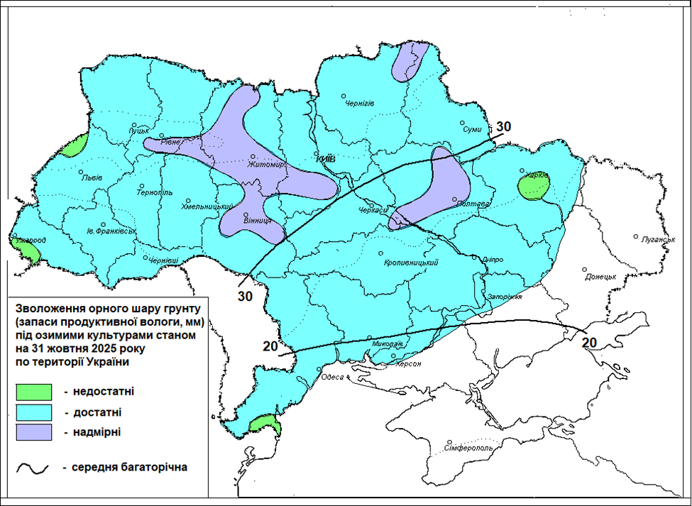 Станом на 31 жовтня запаси продуктивної вологи орного шару ґрунту під озимими культурами на більшості площ були достатніми та оптимальними (21–45 мм), місцями у центральних, північних та Рівненській областях – надмірними (45 мм і більше продуктивної вологи).