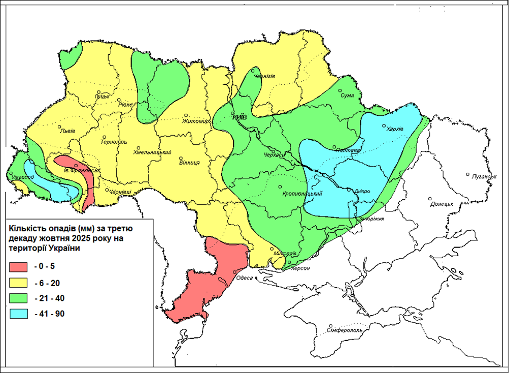 Зображення. 2. Кількість опадів за третю декаду жовтня 2025 року на території України, мм