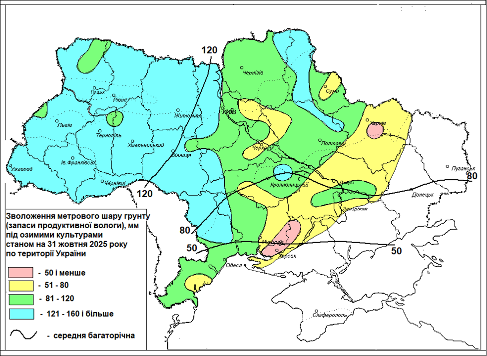 Зображення. 4. Зволоження метрового шару ґрунту (запаси продуктивної вологи) під озимими культурами станом на 31 жовтня 2025 року по території України, мм