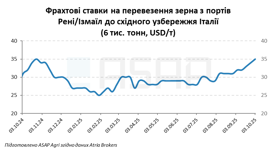 У сегменті костерів фрахт для перевезення 6 000 т кукурудзи з українських дунайських портів до Східного узбережжя Італії піднявся до 35–37 USD/т (+2 USD/т).