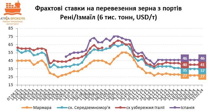 Станом на 22 лютого, ставки на перевезення кукурудзи костерами 6000 т з портів Рені та Ізмаїл підвищилися у напрямках Ізраїлю на 2-4 USD/т– до 41-42 USD/т та східного Середземномор’я – на 2 USD/т до 37-38 USD/т. Мінімальні рівні до східного узбережжя Італії зросли на 1 USD/т і ставки становлять 41-42 USD/т. Без змін залишилися ставки до Мармари – 27-28 USD/т, східного узбережжя Греції – 31-32 USD/т, Іспанії – 46-48 USD/т та Севільї – 48-50 USD/т.