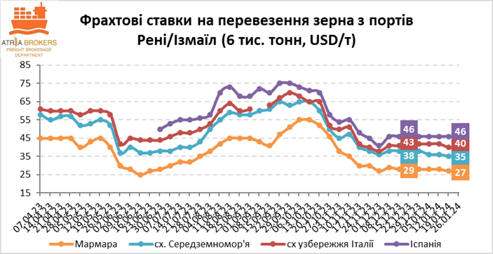 Станом на 25 січня, ставки на перевезення кукурудзи костерами 6000 т з портів Рені та Ізмаїл за всіма ключовими напрямкам залишилися на рівні минулого тижня. Фрахт у напрямку Мармари становить 27-28 USD/т, східного узбережжя Греції – 31-32 USD/т, східного Середземномор’я – 35-36 USD/т, східного узбережжя Італії – 40-42 USD/т, Ізраїлю – 42-44 USD/т, Іспанії– 46-48 USD/т та іспанської Севільї – 48-50 USD/т.