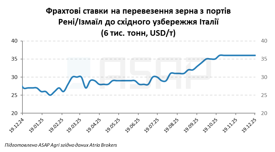 У сегменті костерів фрахт для перевезення 6 000 т кукурудзи з українських дунайських портів до Східного узбережжя Італії оцінюється на рівні 36–38 USD/т, також без змін за тиждень.