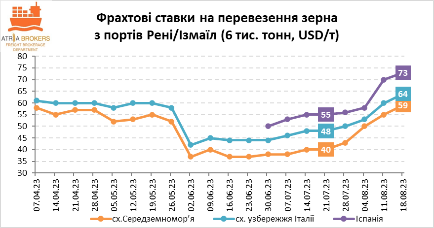 Станом на 17 серпня 2023 р. ставки фрахту на перевезення кукурудзи коастерами 6000 т. з портів Рені та Ізмаїл до Ізраїлю підвищилися на 5 USD/т до 65 USD/т. Ставки до східного узбережжя Італії зросли на 4 USD/т до 64 USD/т, до східного Середземномор’я на 1-4 USD/т до 59-61 USD/т, до Іспанії на 3 USD/т до 73 USD/т і до Криту на 2-3 USD/т до 55-57 USD/т.