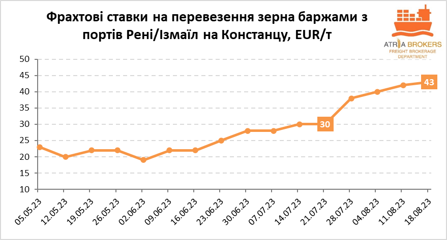 Також спостерігалось підвищення фрахту на перевезення кукурудзи баржами на Констанцу на 1 EUR/т до 43 EUR/т. Фрахт для ріпаку та ячменю підвищився на 3 EUR/т до 50 EUR/т.