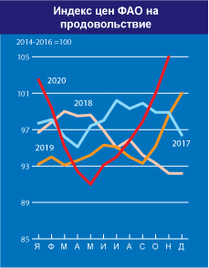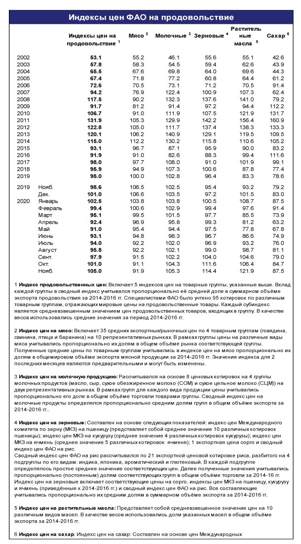 В ноябре 2020 года среднее значение Индекса продовольственных цен ФАО* (ИПЦФ) составило 105,0 пункта, что на 4,0 пункта (3,9 процента) выше октябрьского значения и на 6,4 пункта (6,5 процента) выше соответствующего показателя прошлого года. В этом месяце ИПЦФ не только продемонстрировал наиболее значительный месячный прирост с июля 2012 года, но и достиг своего максимального уровня с декабря 2014 года. В ноябре выросли значения всех входящих в ИПЦФ подиндексов, причем больше всего вырос подиндекс цен на растительные масла и в меньшей степени – подиндексы цен на сахар, зерновые, молочную продукцию и мясо.