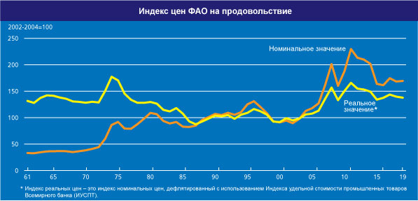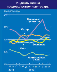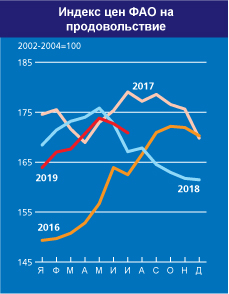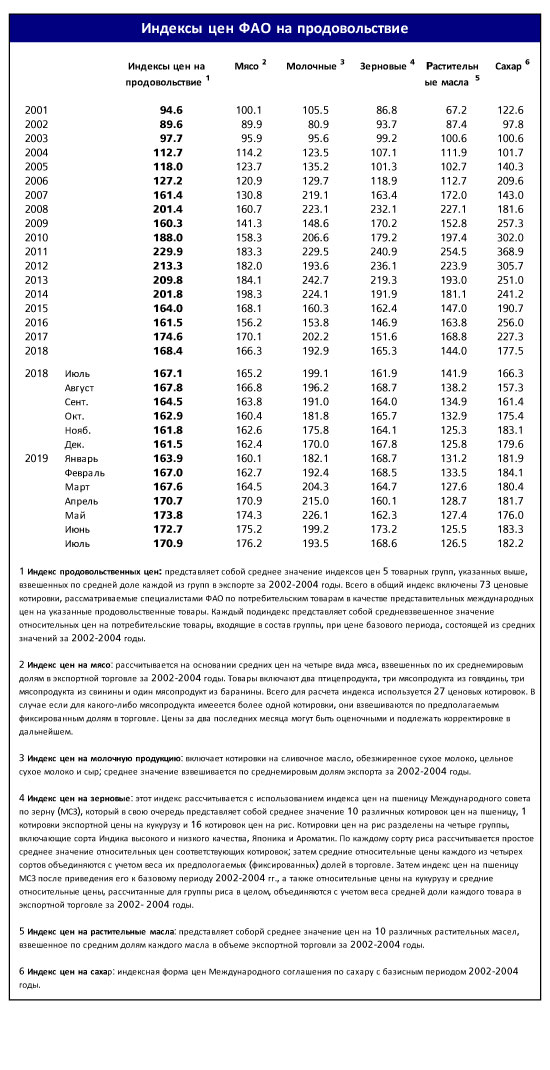Среднее значение Индекса продовольственных цен ФАО* (ИПЦФ) в июле 2019 года составило 170,9 пункта, что на 1,1 процента (1,8 пункта) ниже по сравнению с июньским показателем и на 2,3 процента выше по сравнению с уровнем июля 2018 года. Сокращение значения Индекса по сравнению с уровнем предыдущего месяца объясняется снижением цен на некоторые виды зерновых, молочную продукцию и сахар на фоне лишь незначительного укрепления котировок мяса и растительных масел.