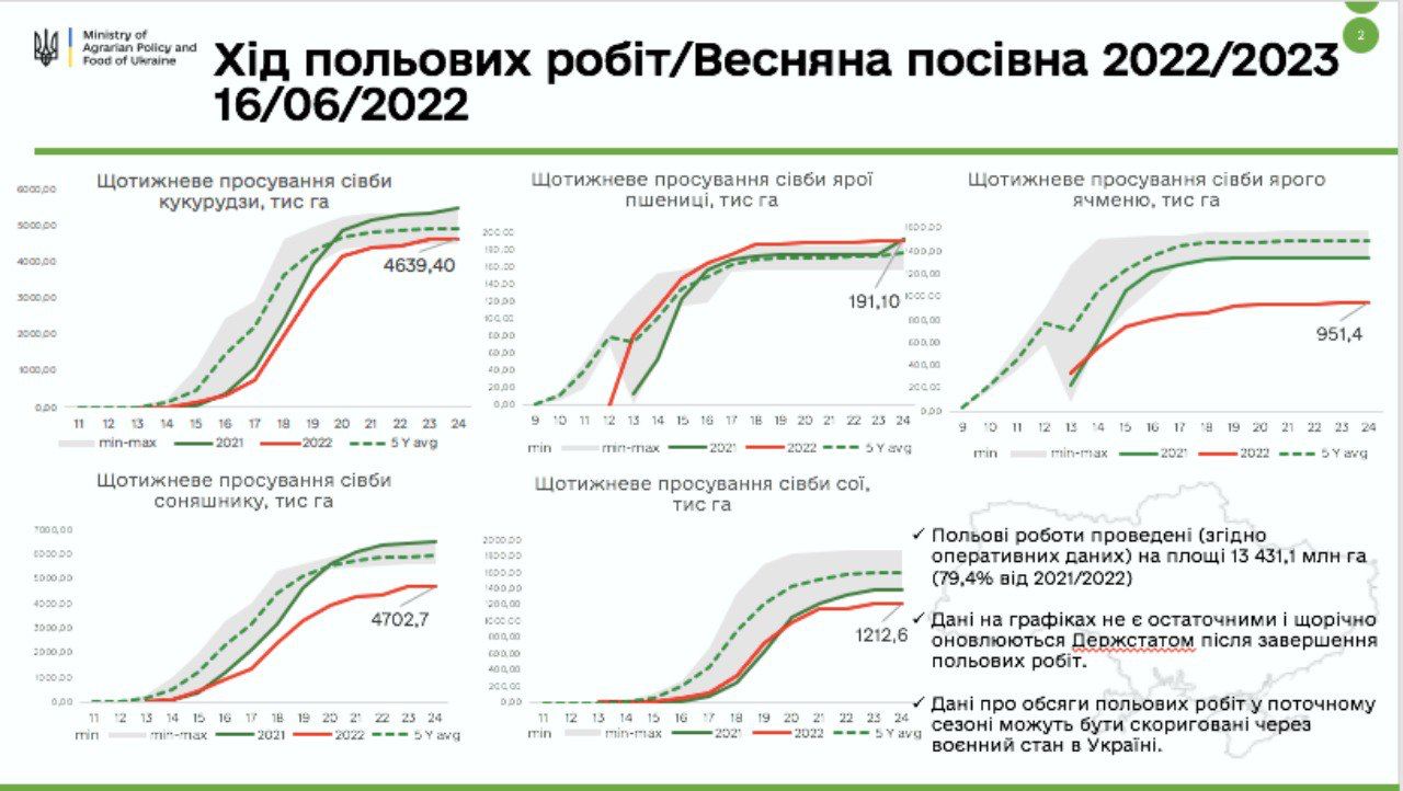 Аграрии Украины завершили работы по посевной. Прогнозируемые посевы основных яровых сельскохозяйственных культур под урожай 2022 года на контролируемой Украиной территории составляли 14 163,4 тыс. га, что на 2 752,9 тыс. га меньше показателя прошлого года (16 916,3 тыс. га).
